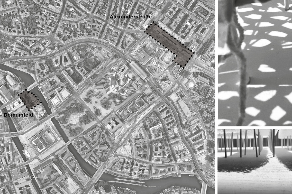 Die Freifläche westlich des Doms wird im Tagesverlaut von den Schlagschatten des angrenzenden Neuen Museums und des Doms verdunkelt. Es wird ein eigenständiger Frei-raumcharakter zwischen den bedeutenden Gebäuden und den offenen Stadträumen der Museumsinsel gesucht. Über die Fläche der Alexanderstraße werden zukünftig mehrere Hochhausschatten streichen. Der Entwurt sollte Schatten erzeugen und gleichzeitig eine Antwort auf die stadträumliche Situation am Alexanderplatz